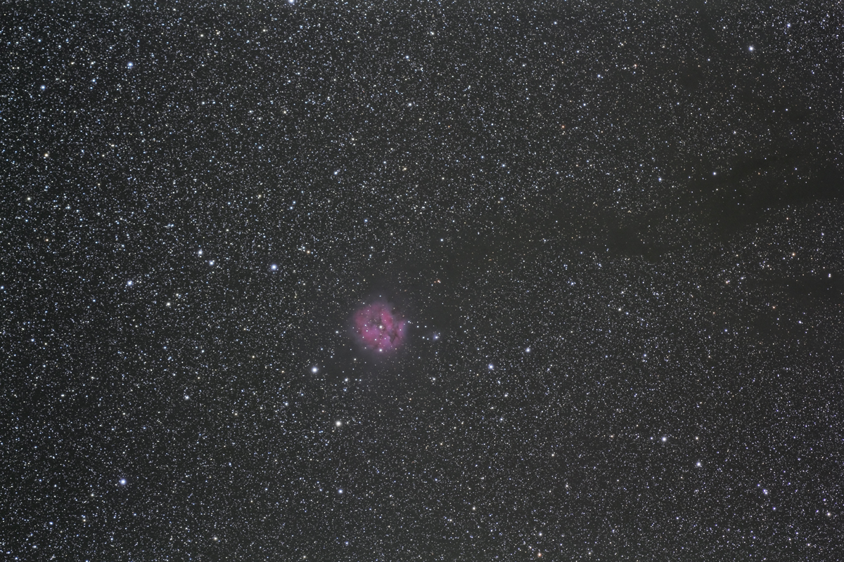 | Der Kokon-Nebel (IC 5146) ist ein Emissionsnebel aus ionisiertem atomaren Wasserstoff im Sternbild Schwan. Er befindet sich am östlichen Ende der länglichen Dunkelwolke Barnard 168 und bildet mit dieser zusammen einen Teil einer ausgedehnten Molekülwolke. Im Kokon-Nebel entstehen seit wenigen hunderttausend Jahren laufend neue Sterne, was zur Bildung des jungen offenen Sternhaufens Collinder 470 führte. Der hellste Stern im Zentrum (Helligkeit 10 mag) zeichnet einerseits verantwortlich für die Ionisation des Nebels und sein rötliches Leuchten, andererseits schafft sein kräftiger Sternwind zugleich "Höhlen" im Staub und Gas der Molekülwolke, was uns überhaupt erst einen Blick in sein Inneres ermöglicht. Der ganze Komplex befindet sich in einer Entfernung von 3000 Lichtjahren, was uns den 10 Lichtjahre durchmessenden Nebel nur 10 Bogenminuten gross erscheinen lässt. |