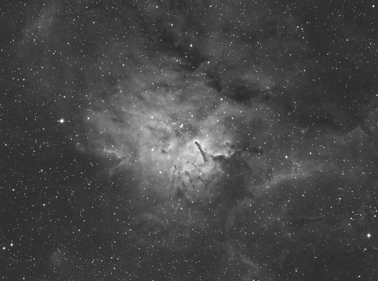 | Das Besondere an diesem schönen Emmissionsnebel sind die "Säulen" aus Gas und Staub, die sich in seinem Inneren aufgrund des Strahlungsdruckes der umliegenden Sternen gebildet haben. An den Enden dieser Säulen sind sog. Proto-Sterne eingebettet, also die Vorläufer von Sternen, die in absehbarer Zeit ihre Kernfusion zünden und zu "richtigen" Sternen werden. Wir sehen also direkt in die "Geburtstätte" von neuen Sternen. |